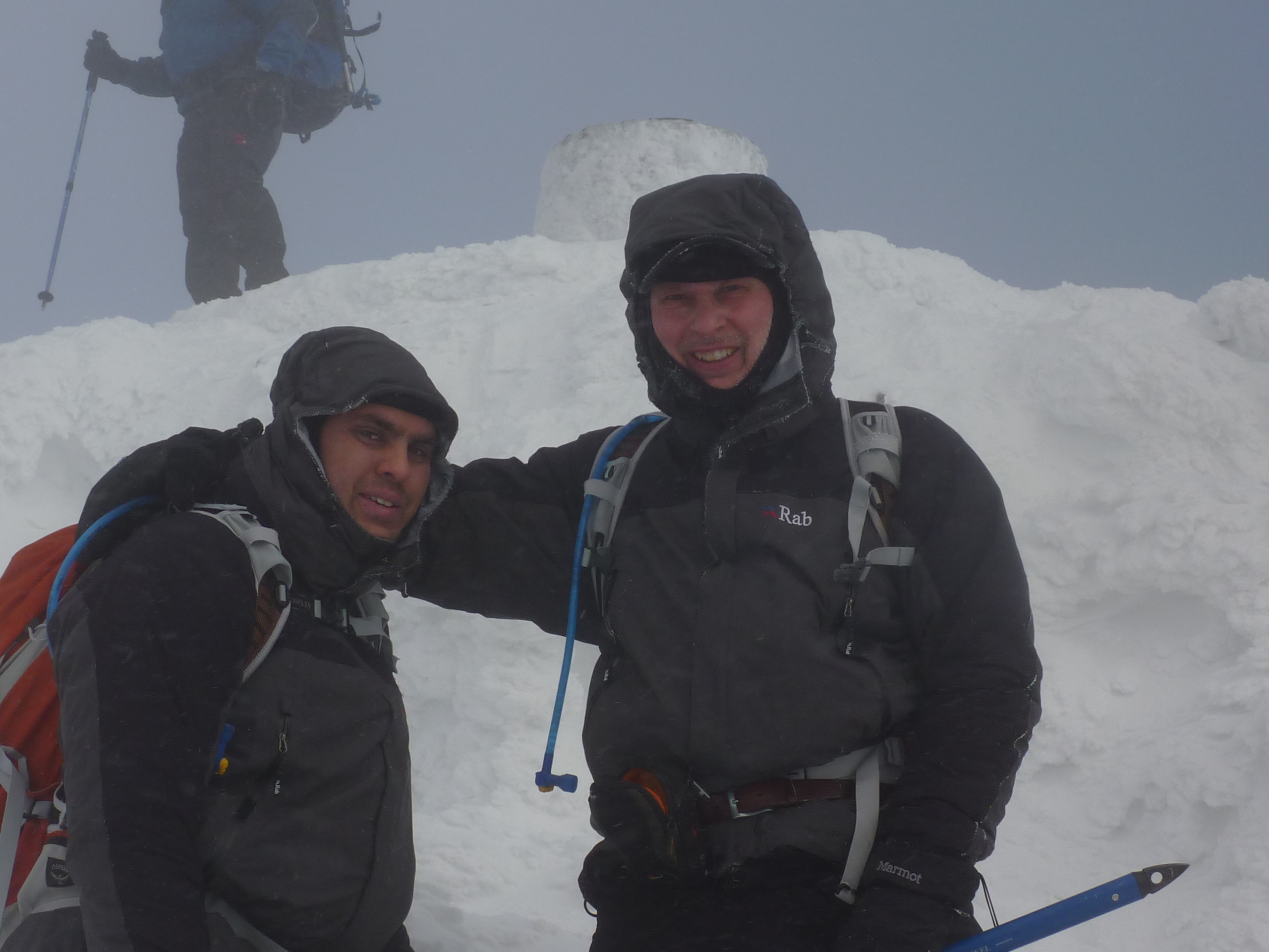 9-10 January - Snowdonia again in the full grip of winter - one month to go to departure. Below: Sachin trying to make a skyline phone call; Barry struggling through a deep snow drift, Crib Goch seen from Capel Curig, and both of us on summit of Snowdon in the freezing wind.